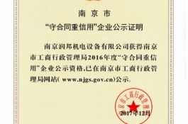 2017年12月29日,接到南京市企業(yè)信用管理協(xié)會通知,潤邦公司再次通過2016年度市級“守合同重信用”企業(yè)的認(rèn)定。誠信潤邦,傾心服務(wù)。潤邦始終把合同管理、信用
